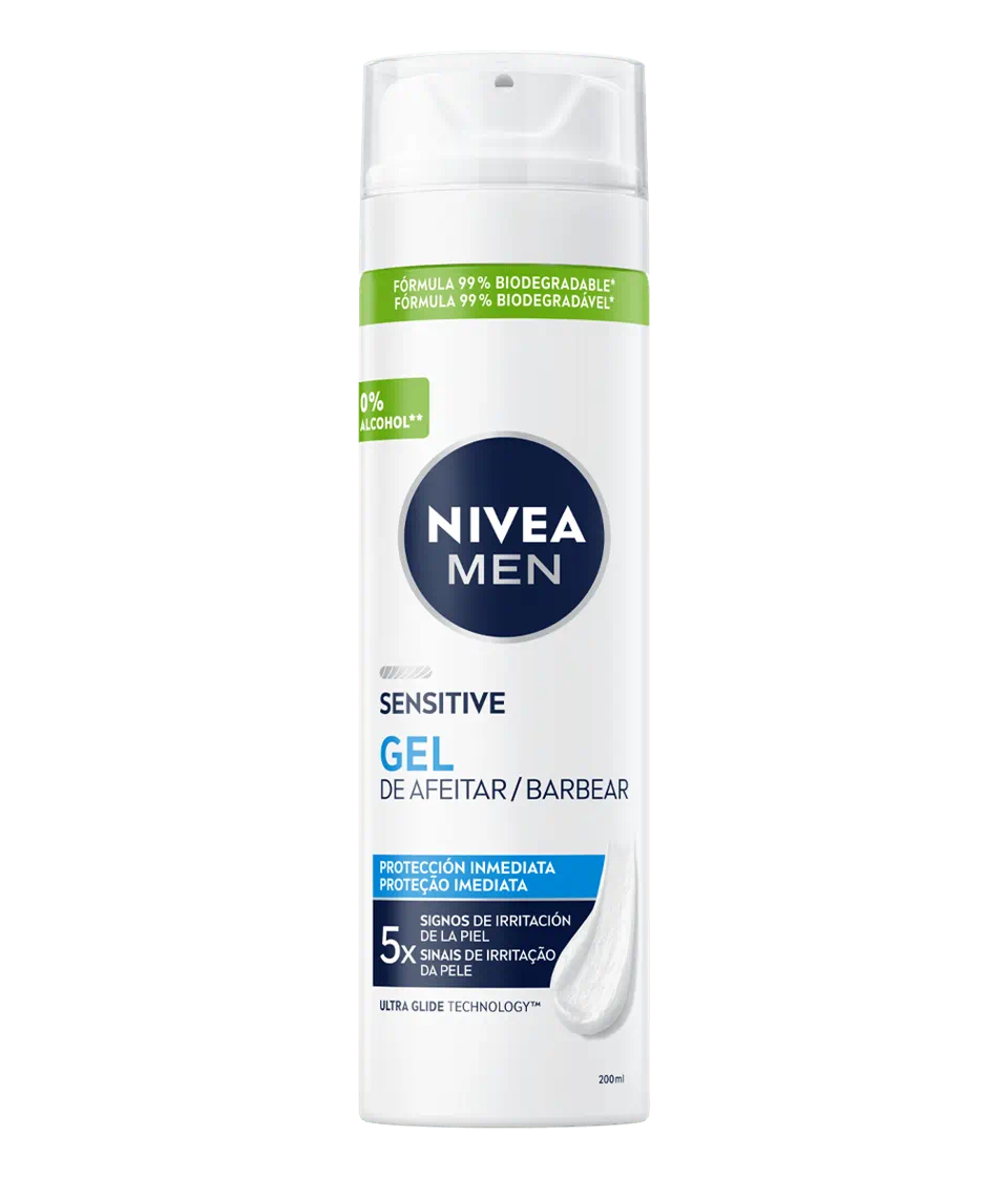 NIVEA MEN Sensitive Gel de Afeitar está diseñado para proporcionar una protección instantánea a los hombres con piel sensible. Su fórmula 99% biodegradable está elaborada con 0% de alcohol etílico, lo que garantiza una experiencia de afeitado suave y sin irritaciones. La fórmula está enriquecida con Camomila y Vitamina E, que ayudan a calmar y proteger la piel de cinco signos comunes de irritación durante el afeitado: ardor, enrojecimiento, sequedad, tirantez y microcortes. Gracias a la tecnología Ultra Glide, el gel suaviza el vello de la barba para un afeitado apurado y suave, reduciendo la fricción y garantizando una experiencia confortable. Además, la Provitamina B5 nutre la piel, dejándola sana, suave y cuidada.